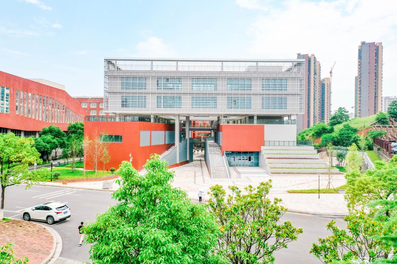 在外墙色彩的选用上,延续校区整体风格,以红、灰白色为主,辅以各种简洁的现代建筑构件,通过色彩与质感的对比使其突出性格特征,使建筑显得挺拔有力。在外立面的设计上,大胆采用横、竖向线条来点缀和充实普通外墙砖,同时为室外空调位考虑了位置,取得良好的效果。建筑物色彩谐调、脱俗。整个建筑通过建筑公共空间有效地组织人流、车流以及与城市道路的对景关系,体现出新旧建筑的对话与呼应。