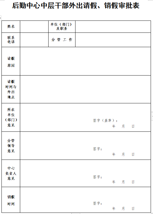 后勤中心中层干部外出请假、销假审批表