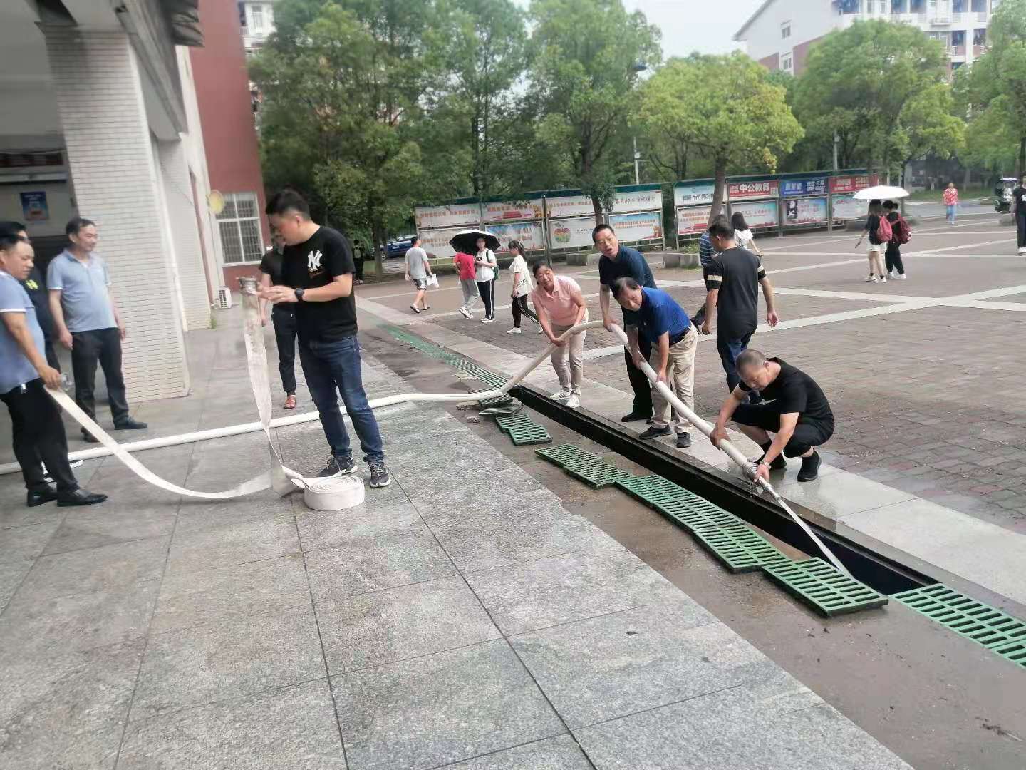 把屋檐沟井盖板揭开,一股恶臭扑鼻而来,经过的师生们掩鼻而过。同志们不皱一下眉,手持长长的消防水管,对准沟渠,进行冲洗;拿着铁铲,把已经沤坏了的枯叶杂物铲出;用扫地机高压水枪冲洗地面顽渍;用竹扫把清扫地面特别是地板砖缝隙中的淤泥……