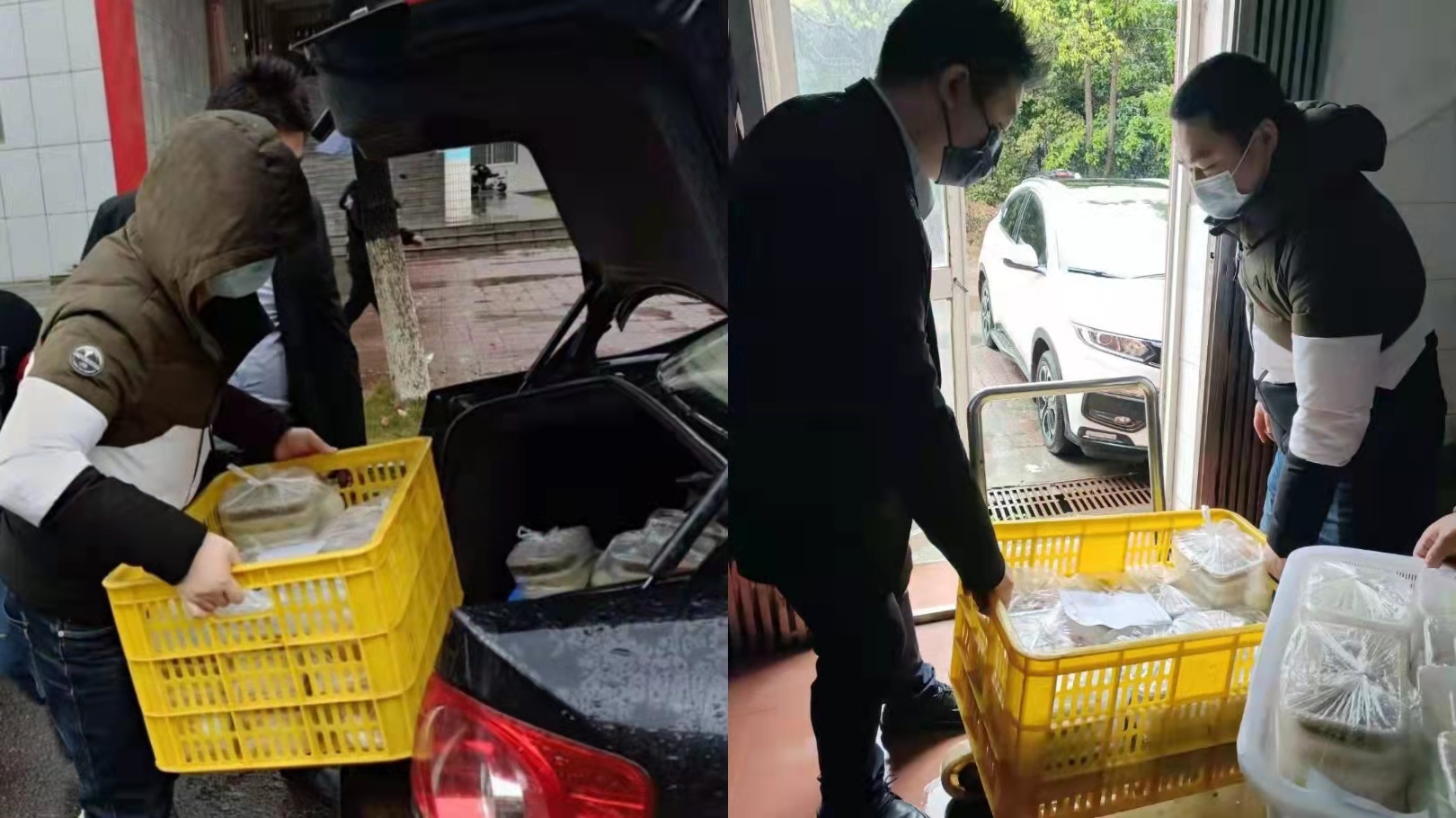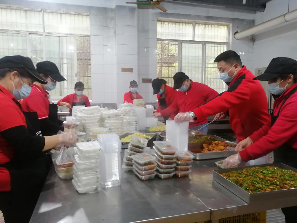 大家分工明确,有的站在食堂门口,拿着大喇叭,提示进出食堂的人员严格佩戴口罩、扫场所码、保持一米距离、提倡打包带走;有的到食堂显眼位置张贴防疫宣传海报;有的帮忙打包、装箱盒饭;有的负责为奋战在抗疫一线的战士们运送、分发盒饭……