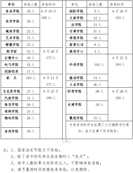 8.结果发放:由于TCT检查结果需要2至3天时间,校医院还要对所有的结果进行分析、总结,体检结果只能在体检结束至少三天后统一发放,具体发放时间会在“理工大卫健群”发消息,到时请每个单位派人前往校医院保健科311室统一领取,原则上不接待个人领取结果;