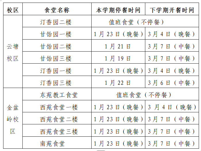 临近放假,学生陆续离校,后勤中心餐饮服务部各食堂停、开餐时间