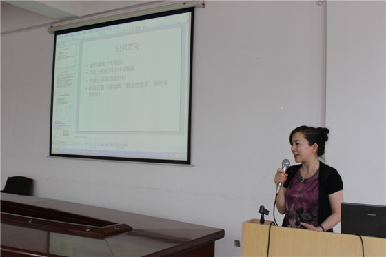 周艺教授从“新型多晶硅太阳电池减反射膜系研究、TiO2染料敏化薄膜太阳能电池研究、功能掺杂TiO2纳米材料可控制备及性能研究、PS模板法合成有序多孔TiO2薄膜的制备及性能、系列功能掺杂TiO2纳米管阵列薄膜的制备及性能”等几项专题介绍了“二氧化钛光电材料研究内容”。在1个小时的讲座中,周教授结合她长期的研究成果及应用实例,深入浅出,让师生们对这一科研领域有了深刻了解。会后曹忠书记作了总结发言,对周艺教授的精彩报告表示感谢,同时对现场师生提出期许,并鼓励学生报考学院研究生以进一步深造。