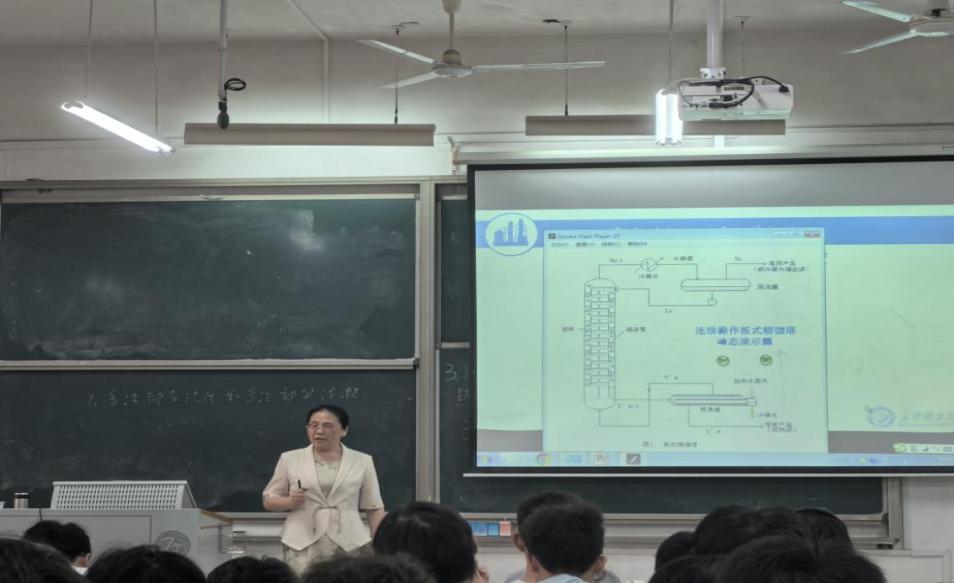 本次示范课聚焦《化工原理》中的核心内容“精馏——多级蒸馏过程”。黄灵芝副教授以我国著名化工专家余国琮院士分离重水的重大科学贡献为切入点,将厚重的学科历史与前沿的工程应用巧妙融合,瞬间点燃了课堂。她通过清晰严谨的推演,生动阐释了精馏过程的科学本质;结合精馏塔结构的可视化剖析,将复杂的工程设备原理转化为学生易于理解的知识脉络。整堂课设计精妙,理论紧密联系工程实践,展现出深厚的教学功底与鲜明的教学创新特色。