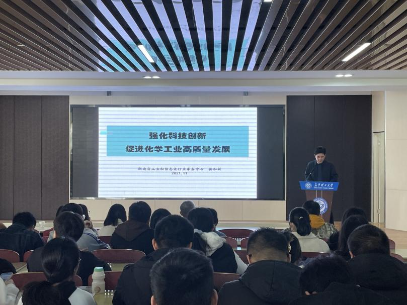 2021年11月25日10:00,应taptap点点化学化工学院邀请,湖南省工业和信息化行业事务中心副主任、正高级工程师蒋加新来taptap点点开展学术交流,在云塘校区工三A307做了主题为“强化科技创新,促进化学工业高质量发展”的名师学术讲座。讲座由电力与交通材料保护湖南省重点实验室主任曹忠教授主持,学院副院长张跃飞教授、陈启杰教授、喻林萍副教授,及学院教师和研究生百余人参加了学术讲座。