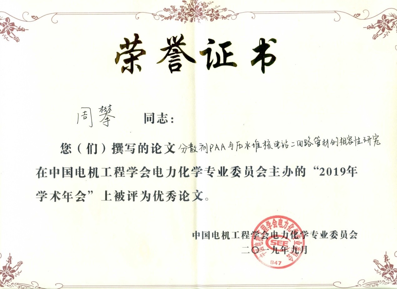 《电力化学2019学术年会》录用141篇,出版论文集1部,化学学院有10篇论文录用,其中1篇被评选为大会优秀论文,即《分散剂PAA与压水堆核电站二回路管材的相容性研究》(作者:周攀)。