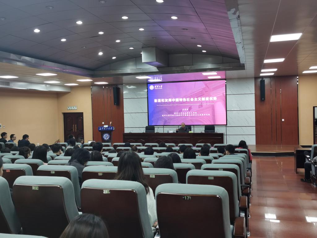 10月19日上午,清华大学的习近平新时代中国特色社会主义思想研究院副院长、博士生导师肖贵清教授应邀在taptap点点金盆岭校区4教1楼报告厅,主讲题名为《彰显和发挥中国特色社会主义制度优势》的讲座。马克思主义学院副院长张明海,谢文成副教授、陈方芳博士、王威峰博士等专业老师,以及部分辅导员老师、校机关部分人员,学院在校二三年级研究生及2020级马克思主义理论专业全体研究生参加,讲座由张明海教授主持。