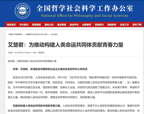 这是全国哲学社会科学规划办公室门户网站“社科动态”栏目第2次全文转载推介艾楚君的理论成果。该栏目曾于2021年8月31全文转载推介艾楚君的理论文章《为推动构建人类命运共同体贡献青春力量》(原文载《光明日报》,2021年8月31日)。