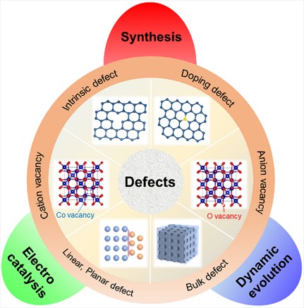 2023年1月11日,张怡琼以第一作者与通讯作者在《Advanced Materials》期刊上发表题为“Insights into the Dynamic Evolution of Defects in Electrocatalysts”的综述论文。电催化被认为是缓解能源问题并以温和方式生产燃料或增值化学品的最有效方法之一。催化剂是催化体系的核心,高效的电催化反应离不开催化剂的精心设计。开发高效稳定的电催化剂对发展先进的能源转化装置具有重要的战略意义。早期研究表明电催化剂表面缺陷的构筑,对电催化性能的提高具有正效应,追踪缺陷结构的动态变化对于理解催化反应机理有着重要作用。该论文主要围绕缺陷电催化剂最新研究成果,综述了在析氧反应、析氢反应、氮还原反应、氧还原反应、二氧化碳还原反应中缺陷动态演化过程的研究进展以及运用各种先进的原位表征方法探究缺陷的动态演化规律,揭示了缺陷动态演化对催化反应的影响机制。该综述有望为高性能缺陷电催化剂的设计和合成提供借鉴与指导。