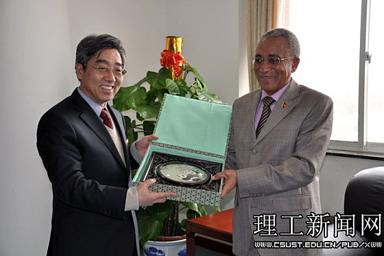 President Zheng firstly expressed his sincere gratitude to Mr. Ambassador for his visit to Hunan Province. After that President Zheng started to introduce CUST in detail such as its history, development, strengths as well as its cooperation with other universities. President Zheng particularly talked about the life and study of Angolan students in CUST. Mr. Ambassador paid tribute to our school for its efforts to create such a good living and learning environment for Angolan students. He also expressed his willingness to take this opportunity to promote the educational and cultural exchanges between CUST and universities of Angola. After the meeting, Mr. Ambassador and his entourage also visited the beautiful campus with great interests.