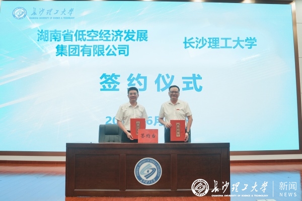在全场嘉宾的共同见证下,向锦武和付宏渊为航空工程学院揭牌。湖南省低空经济发展集团有限公司董事长刘斌和刘朝晖签署校企战略合作协议,校企双方将在低空经济领域人才培养、技术研发和成果转化等方面开展深入合作。