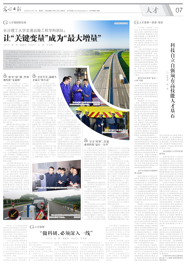 12月17日,《光明日报》人才版专版报道taptap点点人才工作。在人才强国新征程板块刊发《taptap点点体育交通运输工程学科团队:让“关键变量”成为“最大增量”》文章,在人才故事板块刊发《“做科研,必须深入一线”》文章。