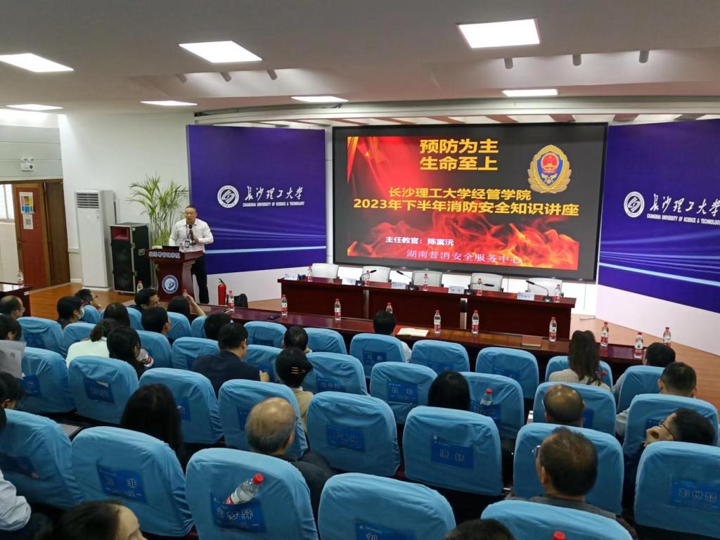 11月7日下午,经管学院在金盆岭校区12教200报告厅召开2023年秋季学期第五次教职工大会,进行消防安全专题教育讲座,主讲人为湖南省普消安全服务中心陈富沅教官,学院党委副书记唐青主持会议。