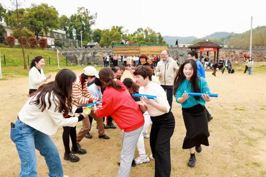 上午9时,老师们集体乘大巴车抵达目的地。在教练的带领下,老师们分六组在草坪上开展了丰富多彩的团队拓展活动。“珠行千里”环节,老师们尽情投入,展现出高度的团队协作精神与默契配合能力。“鼓动人心”游戏更是将气氛推向高潮,队员们默契配合,展现出课堂外的活力风采。现场加油声、欢呼声此起彼伏,团队凝聚力在互动中悄然升华。
