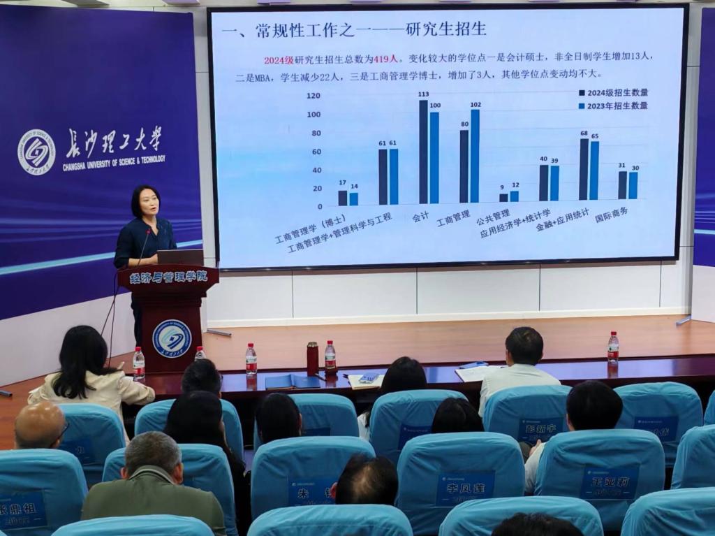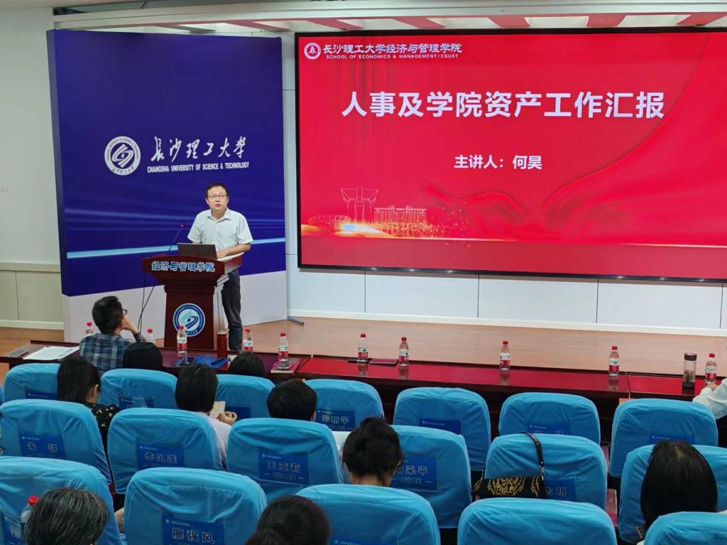 院长彭新宇通报了前段时间科技工作开展情况,对前段时间各项工作进行总结,讲解学校内部治理的变化,并对应用经济学博士点申报进展、学风建设年、师德师风建设等五项需要强调的重点工作作了说明。接着,彭新宇作了题为《讲“普通话”还是“家乡话”:关于差异化竞争优势的思考》的报告,从问题提出、我们的比较优势及必须坚持的方向等三个方面剖析了数智时代传统商科教育遭受的挑战,分析了学院现有比较优势,强调在讲好“普通话”的基础上讲好“家乡话”,传承、强化行业办学特色,主动对接学校交通、电力等优势学科,确立“行业特色+数智改造”的专业建设思路,开发行业、数智商科课程,选派教师到行业企业定岗锻炼,开展面向行业特色领域的研究,培养行业所需经管复合型人才。