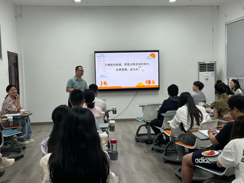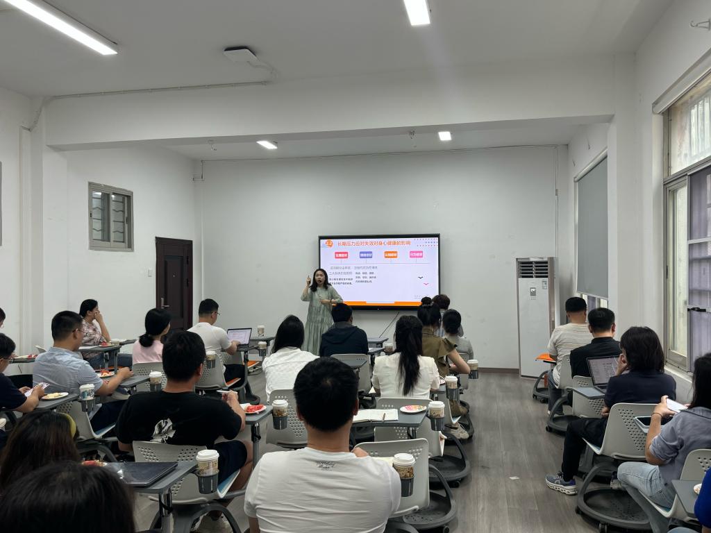 杨爽以“压力、危机与成长”为题,并结合工作和生活中的案例展开此次培训。她首先从国民整体数据、大学生群体的数据以及本校学生的数据进行当下心理健康状况的分析,并提炼出学生主要压力源;随后从压力源入手,将压力源至心理危机的整个发展过程进行梳理,在这个过程中就压力应对、危机的识别与应对等进行了深入讲解并对班主任的工作提出建议;紧接着通过视频和讲述的方式帮助大家认识了解抑郁症的常见症状,理解患有抑郁症的个体可能会出现的痛苦情绪,对一般情况下倾听、陪伴和可用于应急状态下的情绪稳定化技术进行了讲授,并现场带领大家学习和实操了日常情绪保健的方法;最后通过一个案例介绍了萨提亚冰山模型,帮助大家巩固并加深对前述内容以及工作、生活案例的理解。