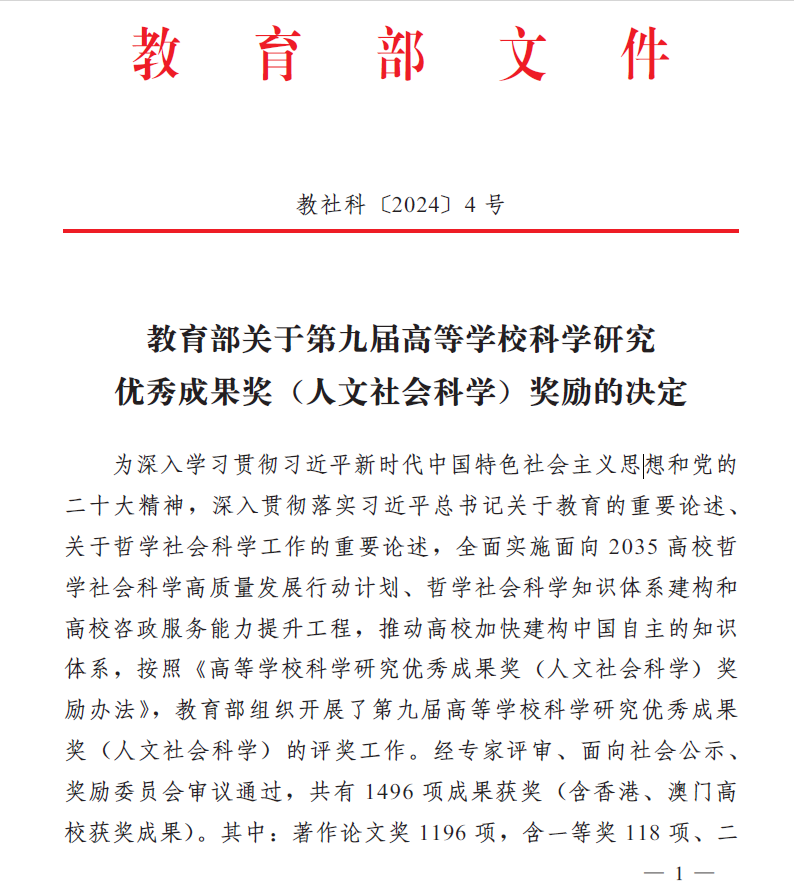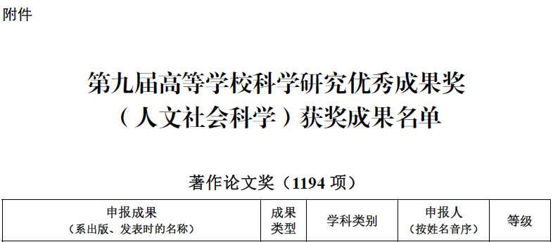 高等学校科学研究优秀成果奖(人文社会科学)始设于1995年,是教育部为表彰全国高校人文社会科学工作者所取得的突出成绩而设立的奖项,每三年评选一次,是目前国内人文社科领域最具公信力和影响力的重要奖项。第九届高等学校科学研究优秀成果奖(人文社会科学)获奖成果共有 1496 项成果获奖 (含香港、澳门高校获奖成果)。其中:著作论文奖 1196项,含一等奖118项、二等奖 513项、三等奖565项;咨询服务报告奖76项;普及读物奖21项;青年成果奖203项。我院教师此次获奖,是taptap点点体育在人文社科领域科研成果的重大突破,将推动学校人文社会科学学科建设迈上新台阶。