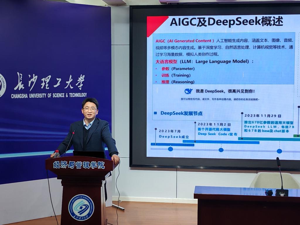 会议最后,数经系曾小青教授为全院教职工带来了一场关于《拥抱AI-Deepseek赋能新商科教育》的精彩讲座。曾小青重点介绍了常用AI工具以及AI提示语设计的常见误区和解决方法,结合经管领域的应用范例,展示了该工具在学术研究、教学方法改进、教学文档准备中的实际成效,并介绍如何从本地部署、Agent等方面深化Deepseek的应用探索,为大家今后更好地利用人工智能技术解决实际问题提供了思路和借鉴。