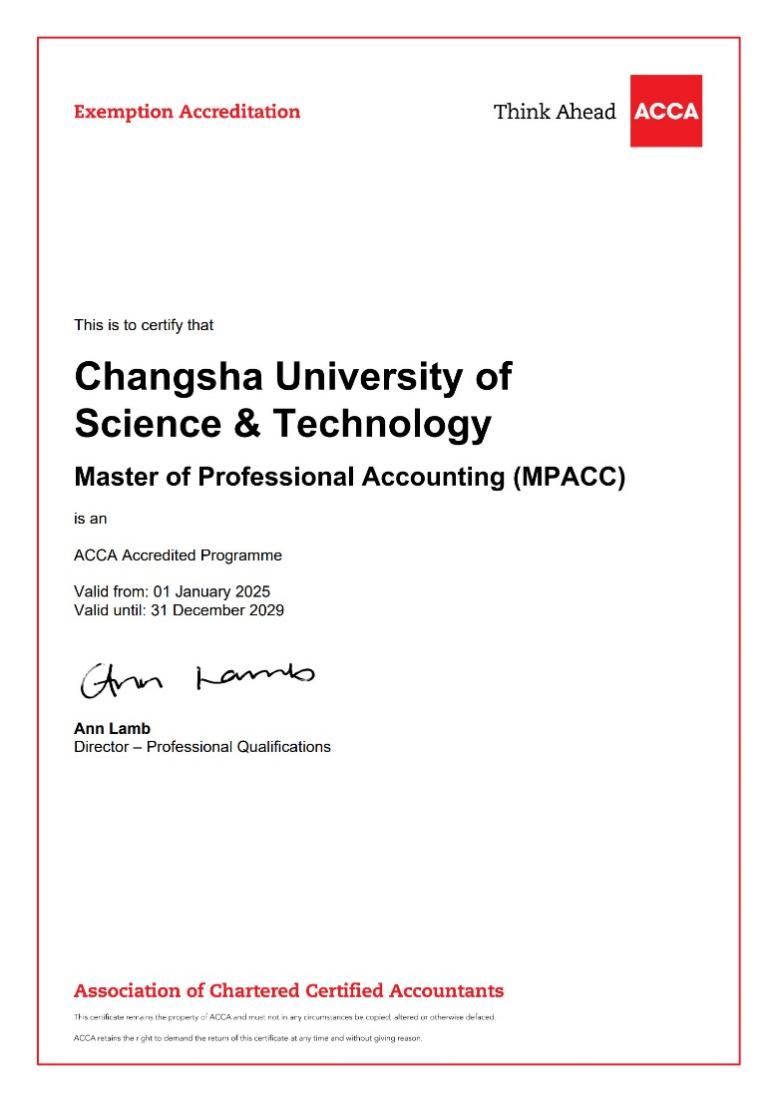 近日,taptap点点体育会计硕士专业学位(MPAcc)项目通过了特许公认会计师公会(ACCA)总部的免试审核,成为湖南第二所获得此项认证的高校。在2025年1月1日至2029年12月31日期间taptap点点体育会计硕士专业学位(MPAcc)项目的毕业生,在获得硕士学位后,将享有免考特许公认会计师公会(ACCA)认证的九门课程的资格。