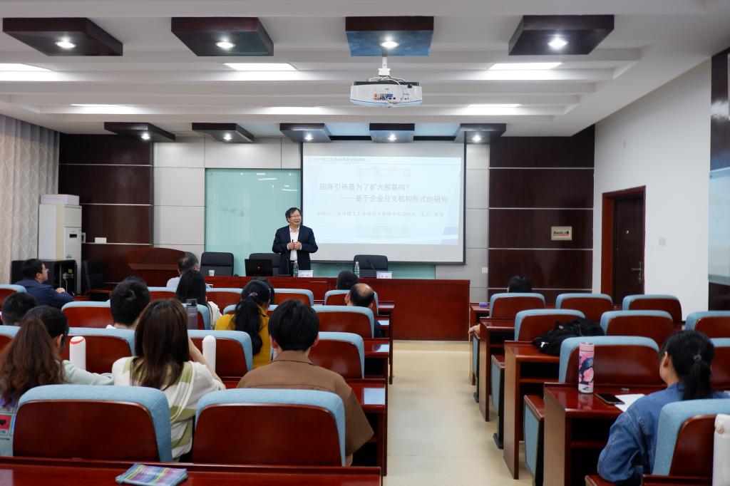 2021年4月29日上午9点,重庆大学经济与工商管理学院刘斌教授应我院邀请,在金盆岭校区七教212进行了“招商引资是为了扩大税基吗?--基于企业分支机构形式的研究”的学术讲座。经管学院副院长张新华教授、计财处副处长郑永生副教授、部分老师以及80余名硕博士研究生参与了本次讲座。本次讲座由经管学院副院长王治教授主持。