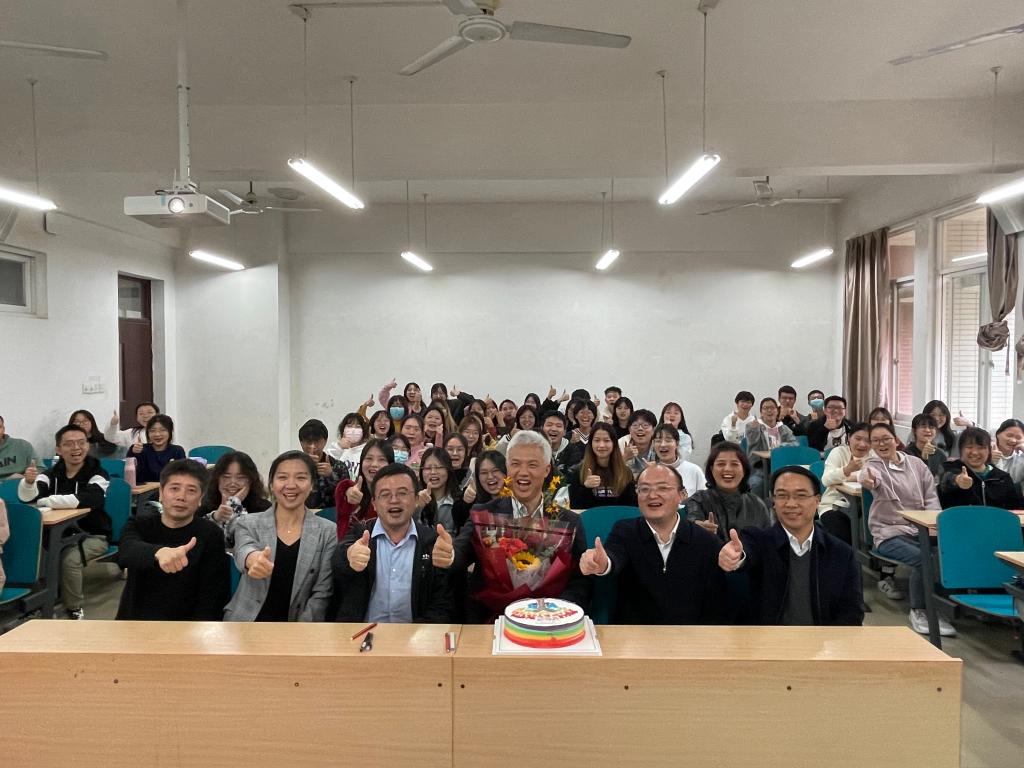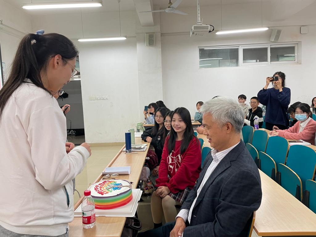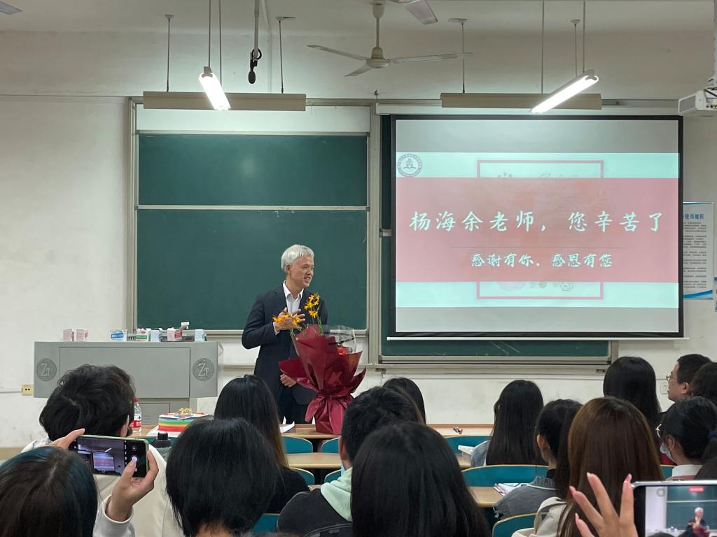 2021年11月4日上午11点50分,当下课铃声响起,文科楼B301教室里响起了响亮的“起立!”“杨老师,辛苦了!”的声音。原来是国贸2001班、2002班56名同学齐声为他们的任课教师杨海余老师职业生涯最后一堂课送上祝福。学院领导、经贸系系主任、党政办主任、辅导员老师也早早来到经贸系杨海余教师职业生涯最后一堂课,一起见证这一具有特殊意义的时刻。