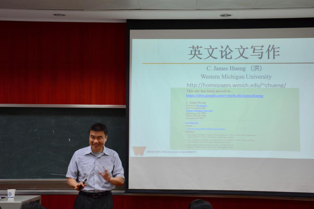 5月16日上午9:30美国西密歇根大学经济学系洪嘉阳教授在金盆岭7教217与我院师生开展“英文论文写作及发表”的学术交流。此次讲座由院长陈银娥主持,学院相关老师、硕士研究生、博士生参加此次讲座。