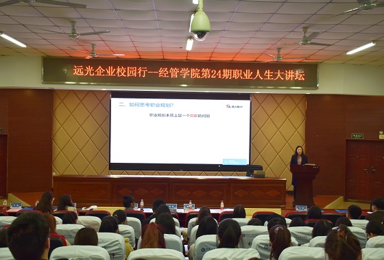3月23日下午,“远光企业校园行—经管学院第24期职业人生大讲坛”在云塘校区文科楼A200顺利举行。远光软件股份有限公司副总裁袁绣华、DAP研发中心需求经理姜敏、“远光·未来星光杯”方案讲解大赛项目负责人郝倩、那迪,经管学院党委书记王宏、就业辅导员王宝宝以及18级辅导员叶鑫出席本次活动。