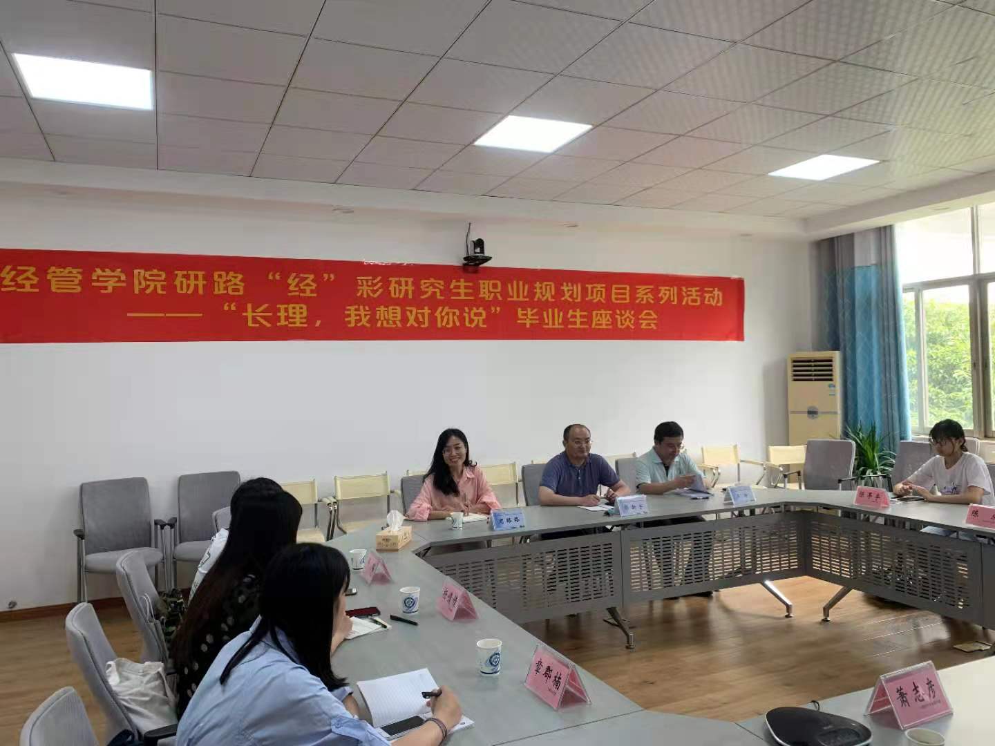 2021年6月7日下午2:30,我院研究生职业规划项目系列之毕业生座谈会于金盆岭校区七教206教室举办,经管学院副院长彭新宇教授、王治教授出席了此次会议,会议由辅导员周路路老师主持,我院18级管理班班长邹瑶、18级非全脱产班陈庆等各专业毕业生代表参会。