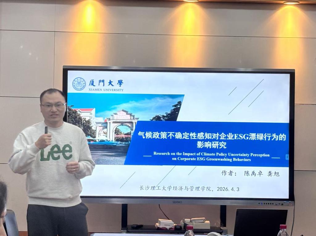 2026年4月3日上午,厦门大学龚旭教授应邀在经管大楼307室主讲金岭学术大讲堂第86期(2026年第2期),主题为“气候政策不确定性感知对企业ESG漂绿行为的影响研究”。讲座由副院长尹筑嘉主持,30余名学院青年教师和硕、博士研究生参加了本次讲座。
