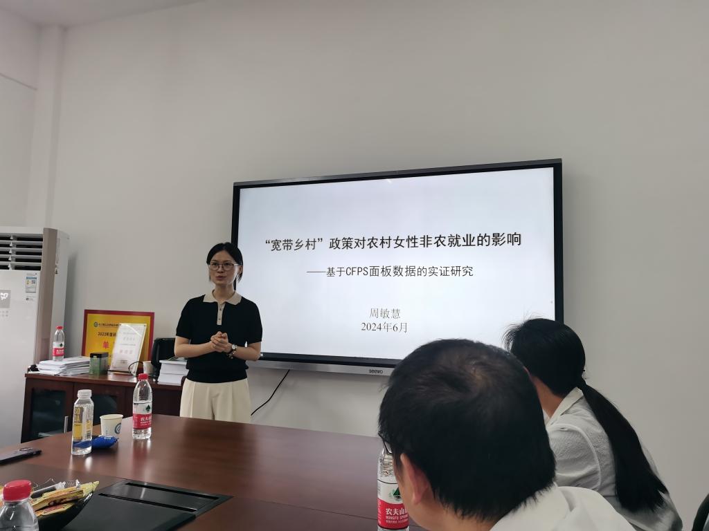 2024625日下午,应我院邀请,对外经济贸易大学政府管理学院公共经济管理系讲师周敏慧老师为我院师生做了题为“宽带乡村”政策对农村女性非农就业的影响的学术讲座。院长彭新宇、经贸系系主任陈洁出席,学院师生30余人参加此次讲座。讲座由学院副院长何昊主持。