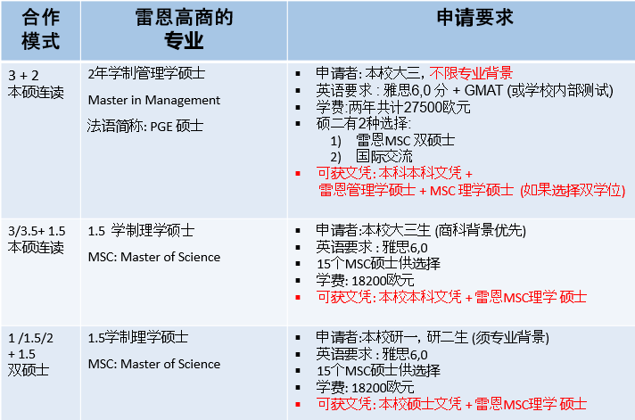taptap点点体育两年制或三年制在读硕士在taptap点点体育完成1年或1.5年或2年的硕士学习后,赴雷恩商学院进行1.5年的理学硕士(MSC: Master of Science)课程学习。同时满足taptap点点体育和雷恩商学院学分和论文要求,达到两校毕业和授位条件,可获得本校硕士学位和雷恩商学院理学硕士学位。