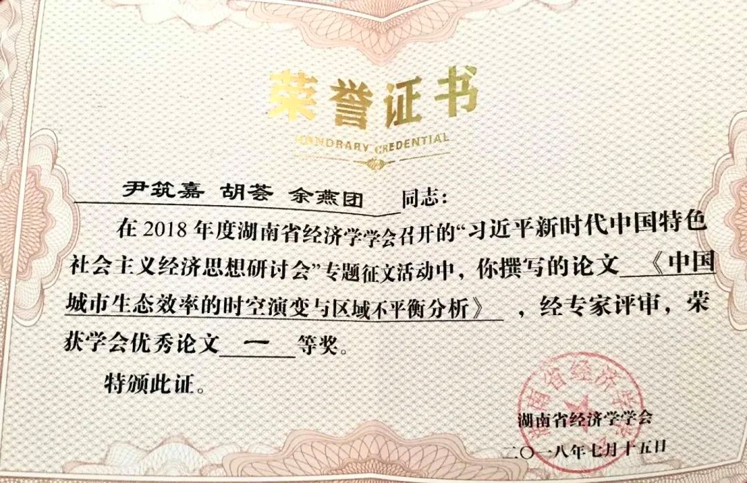 胡荟,经济与管理学院17级经济班学生。她发表论文两篇,包括:尹筑嘉,胡荟,唐谭岭. 中国朱格拉周期与股价波动关联性研究-基于奇异谱的设备制造业分析[J]. 上海财经大学学报,2019, 21(06): 18-34(CSSCI);YuY, HuH, ZhangY,etal. Metafrontier Eco-Efficiency and Its Convergence Analysis for China: A Multidimensional Heterogeneity Perspective [J].Emerging Markets Finance and Trade 2019:1-19.(SSCI)。参与国内学术会议两次:第五届能源与气候经济论坛学术会议;2018年度湖南省经济学学会研讨会,创新、资本与技术转移国际学术会议。论文获得省级奖励三次:2019年创新、资本与技术转移国际学术会议优秀论文奖(省级);2018年湖南省经济学会优秀论文一等奖(省级);2018年第五届能源与气候经济论坛优秀论文二等奖(省级)获得2019年荣获湖南省优秀毕业生称号(校级和省级)、2019年荣获优秀研究生称号(校级)、2017-2018年连续两年荣获一等学业奖学金(校级)、2019年荣获二等学业奖学金(校级)、2018年荣获党校优秀学员(校级)、2018年第二届文献精析大赛中荣获三等奖(院级)等个人荣誉: