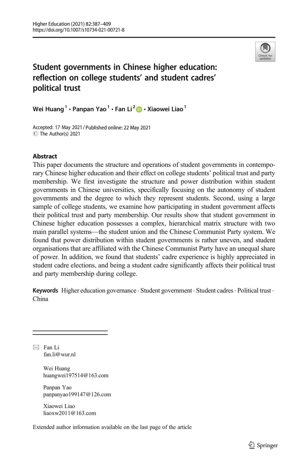 1.2022年以第二作者在《中国软科学》上发表《经济资助对大学生政治信任的影响研究》(管理学A类期刊)