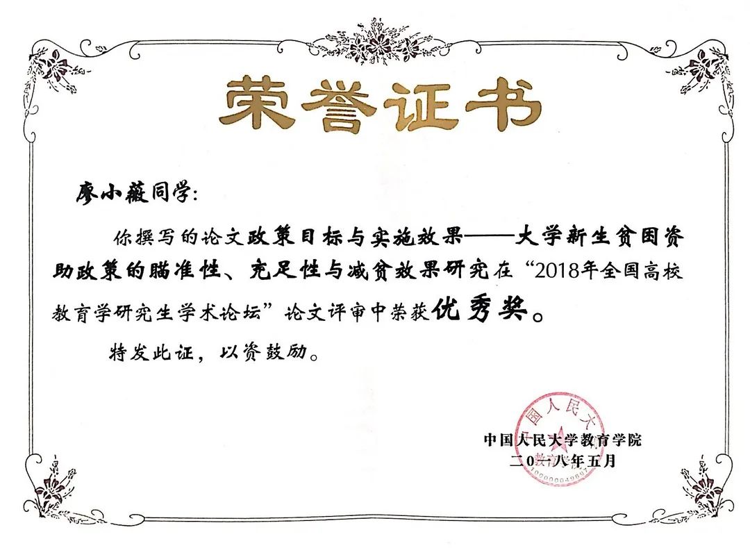 ☑ 获第四届中国教育财政学术研讨会“青年优秀论文三等奖”(2018.11)