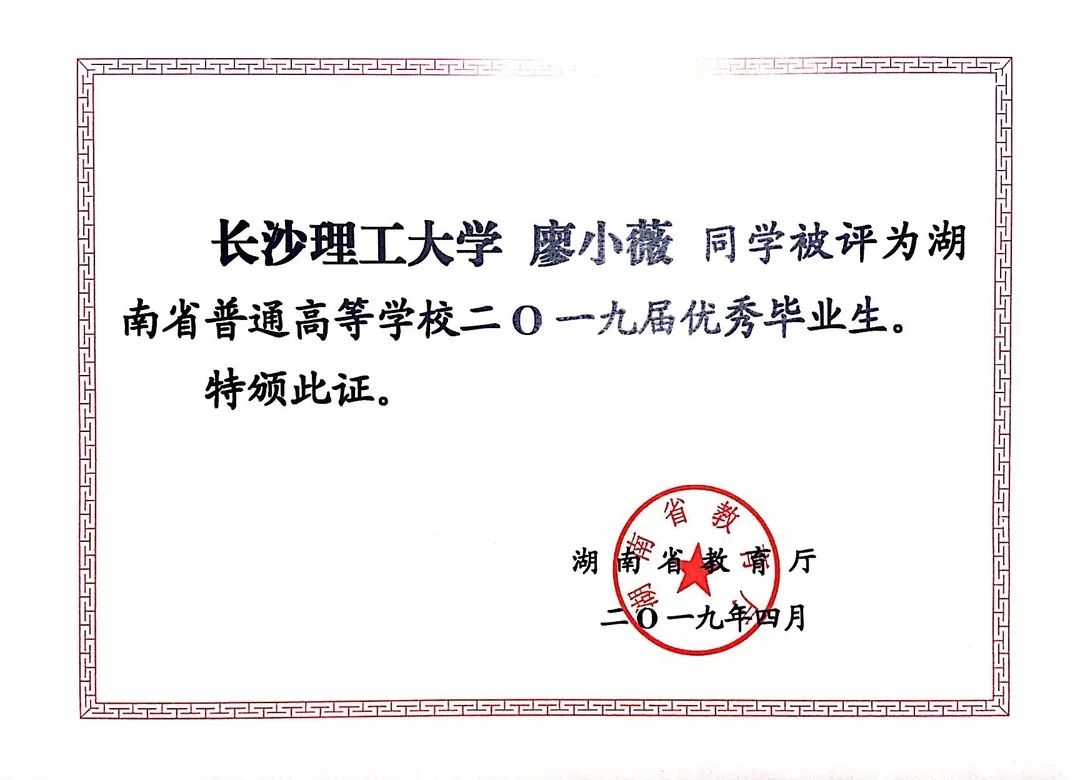 ☑ 获湖南省优秀毕业生(2019.04)