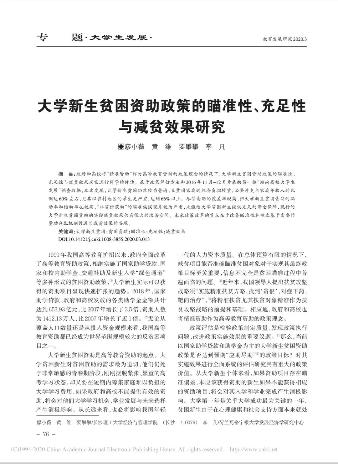 2.2020年以第一作者在《教育发展研究》上发表《大学新生贫困资助政策的瞄准性、充足性与减贫效果研究》(CSSCI期刊)