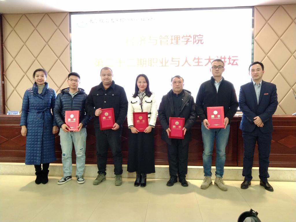 12月20日下午,第二十二期职业与人生大讲坛在云塘校区文科楼A200举行。本次讲坛邀请了经管学院84级财会校友、澧水公司总经理王志宏,02级会计校友、湖南数魔网络科技有限公司副总裁黄琼以及13级国贸校友、中交地产股份有限公司投资经理郭琳为主讲嘉宾,00级国贸校友、湖南联智科技股份有限公司总助罗青兰和07级会计校友、华银电力财务管理部资金处主管卜旭到场交流,校友中心主任李伟、院党委副书记唐青、关工委副主任陈均杰和学工办周路路、王宝宝老师和150余名经管学子参加本次活动。