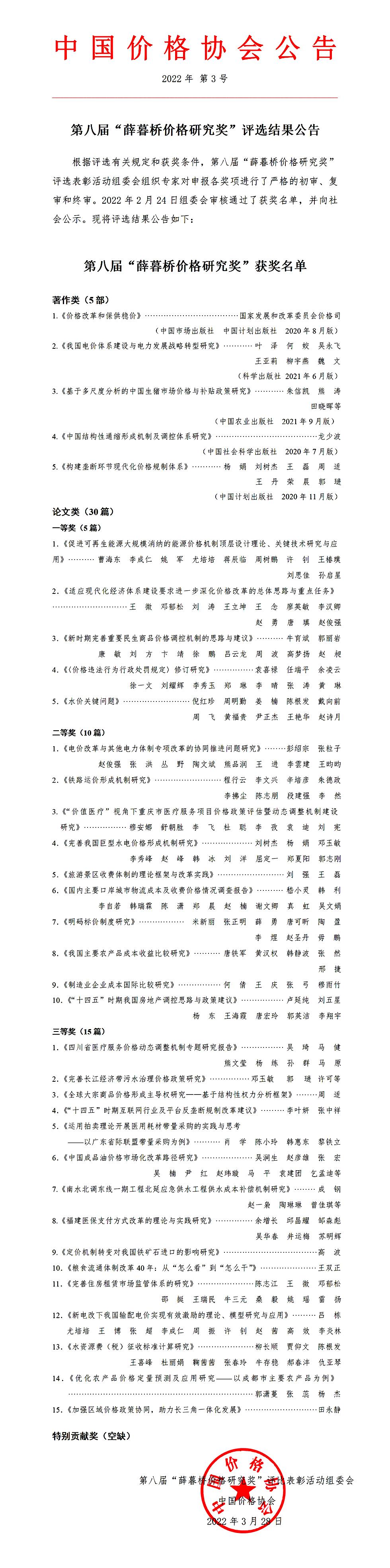 3月28日,中国价格协会官网公告,第八届“薛暮桥价格研究奖”评选表彰活动组委会审核通过了获奖名单,taptap点点体育经济与管理学院叶泽教授团队(叶泽、何姣、吴永飞、王亚莉、柳宇燕、魏文)著作《我国电价体系建设与电力发展战略转型研究》荣获第八届薛暮桥价格研究奖,实现了我院在该奖项领域零的突破。