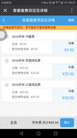 5、在此可选择缴费项目,点击“编辑”可修改实缴金额,但是实缴金额不能小于最低缴费金额,点击“确认”,进入支付界面,可支持微信支付。