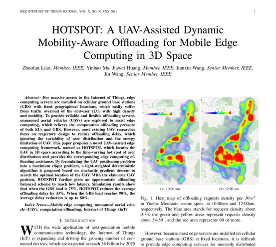 该论文“A UAV-Assisted Dynamic Mobility-Aware Offloading for Mobile Edge Computing in 3D Space”主要研究了无人机辅助地面基站进行计算卸载的3D部署与卸载决策问题。为了使设备大规模地接入到物联网中,边缘计算(MEC)服务器安装在地理位置固定的地面基站(GBS)上,容易受到高密度、移动性强的终端用户(EU)的过载流量。为了提供可靠、灵活的卸载服务,无人机辅助边缘计算,可以减轻EUs和GBS的卸载计算压力。然而,现有的无人机研究大多集中在减少卸载延迟的轨迹设计上,忽略了用户分布的时变性和无人机的能量限制。本文提出了一种新型无人机辅助边缘计算框架——HOTSPOT,该框架根据用户分布的时变性对无人机进行三维空间定位,并提供相应的边缘计算卸载辅助。通过将无人机定位问题转化为最大团问题,提出了一种基于随机梯度下降的轻权重确定性算法来搜索无人机的最优位置。HOTSPOT根据无人机的精确位置,进一步给出了一种机会卸载平衡方案以达到低延迟。仿真结果表明,当GBS负载为75%时,HOTSPOT将平均卸载延迟降低33%。当GBS负载达到90%时,平均延迟降低高达80%。