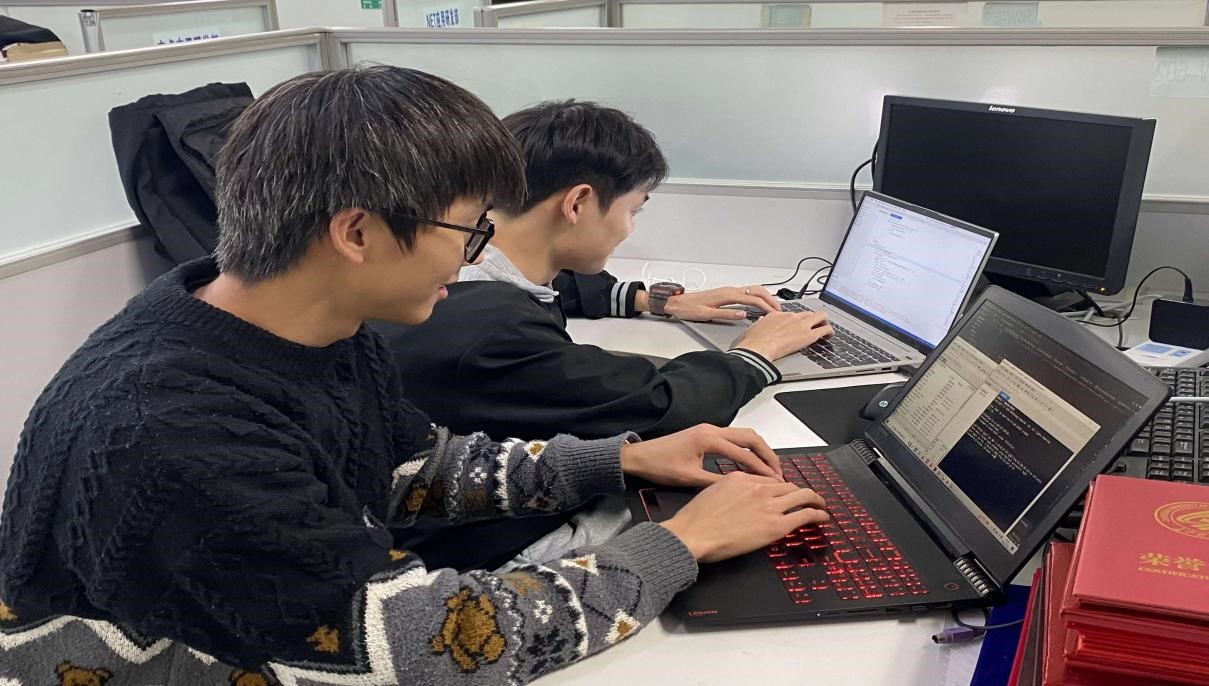 (陆盛超和楚旺同学在工作室研发答题小程序)