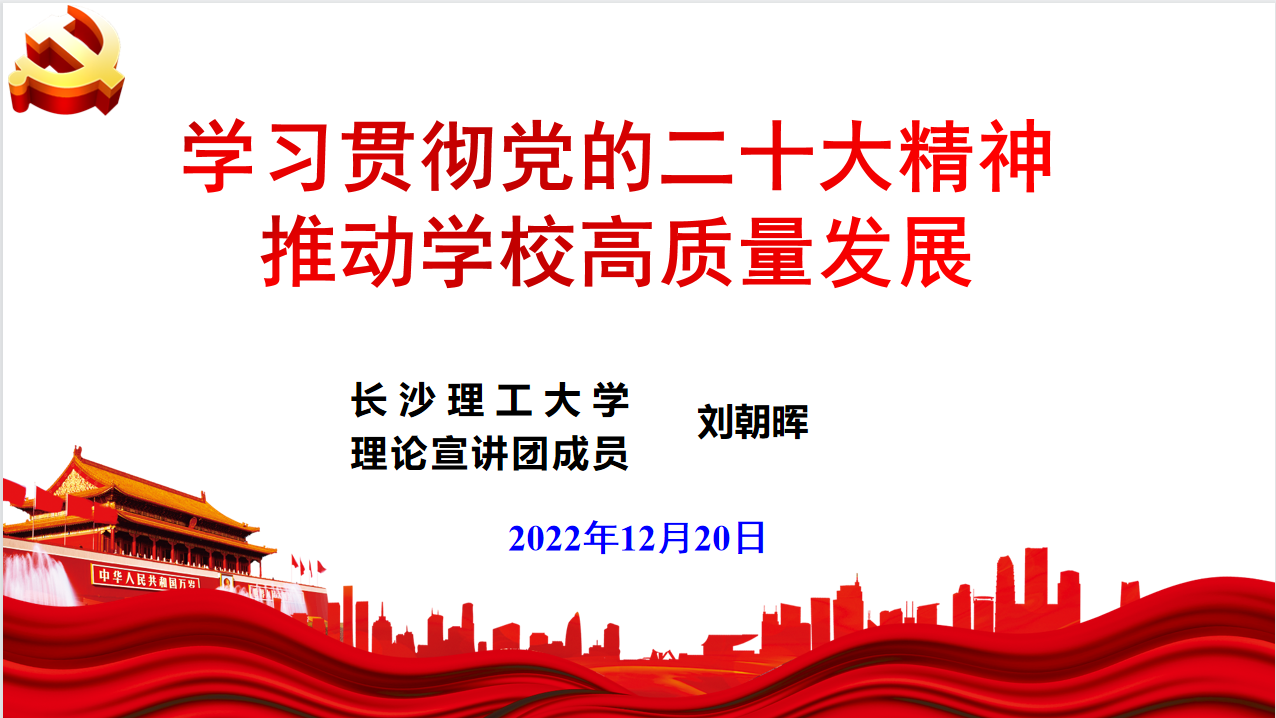 刘朝晖以《学习贯彻党的二十大精神,推动学校高质量发展》为题,围绕全面领会党的二十大主题及主要成果、深刻认识过去五年的工作和新时代十年的伟大变革、不断开辟马克思主义中国化时代化新境界、深入学习了解中国式现代化、全面建设社会主义现代化国家的目标任务、坚持党的全面领导和全面从严治党、应对风险挑战、坚定不移地办好人民满意的大学等八个方面,对党的二十大精神进行了系统阐释和深入解读。他强调,学习贯彻党的二十大精神要与加强学校“双一流”建设、决胜建成“百强”大学的具体工作相结合,要坚持内涵式高质量发展,要加强学科建设,为国家培养更多“底色亮、实践强、有情怀、敢担当”的长理特质人才。
