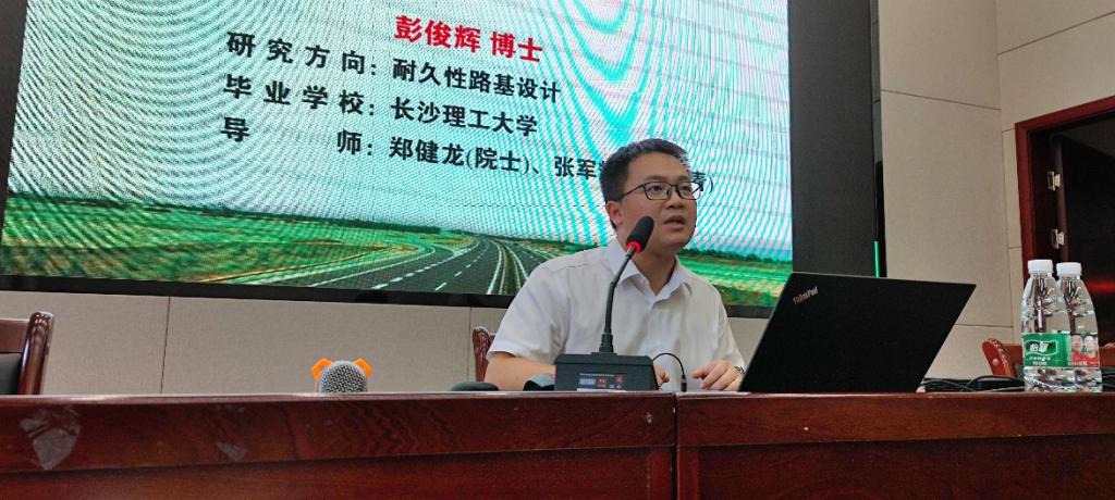 彭俊辉老师的研究领域主要是耐久性路基设计理论与方法的基础研究和技术开发。讲座上半场,彭俊辉老师首先向大家介绍了自己的主要研究成果,即考虑黏弹性质的路基土回弹模量预估模型、考虑湿-力影响的路基湿度场计算方法以及考虑黏弹性的路基结构模量计算方法的研究。随后作了以“路基土回弹模量综合预估方法研究”为题的详细授课,彭俊辉老师从研究的背景和目的、所用材料和试验、试验结果、预估模型的建立与验证、回弹模量预估步骤五个方面对路基土回弹模量综合预估方法研究进行了详细阐述。