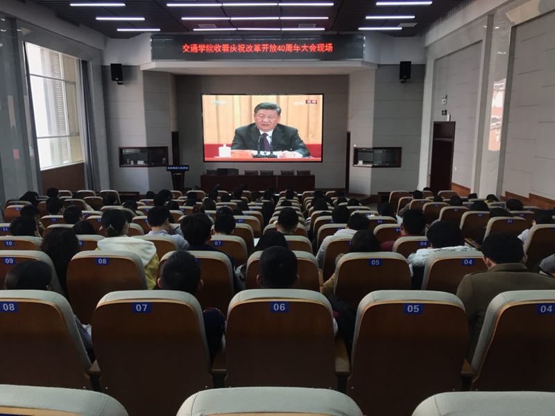 12月18日上午10点,庆祝改革开放40周年大会在北京人民大会堂举行。中共中央总书记、国家主席、中央军委主席习近平出席大会并发表重要讲话。交通学院广大师生员工高度关注大会的召开,在会议室、实验室、办公室、宿舍等地通过电视、网络等进行了收看收听,全体学院领导和近百名师生代表在院交通科技报告厅集中收看了大会实况,聆听习近平总书记的重要讲话,并开展热烈的学习讨论。