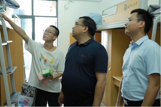 院领导在走访中就家长与新生报到入学相关问题进行了解答,反复叮嘱新生遇到困难要第一时间与老师联系,学院会尽力帮助新生们更好地适应大学生活,解决他们在学习和生活中遇到的各种问题。老师们还详细查看了新生宿舍的设施配备,向新生详细了解各项设备设施的使用体验,鼓励新生们要融洽相处、注意安全、刻苦学习、发挥特长,全面提升自己的综合素养。“对学院新开设的微专业感兴趣吗?”“有没有查看过专业培养方案吗?”“对专业课程有什么期待吗?”老师们还详细询问新生们对未来大学生活的学业规划,鼓励他们要养成良好的学习习惯,尽快完成角色转换,适应新的学习生活环境,以饱满的精神面貌和积极的心态开启充实快乐的大学生活。