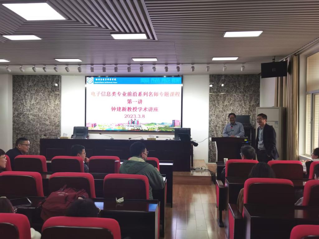 物理与电子科学学院“专业前沿系列名师专题课”于3月8日15点30分在云塘校区理科楼B-413拉开序幕。湘潭大学钟建新教授应邀来taptap点点作为课程第一讲的主讲人。学院党委书记张国强、副院长(主持工作)张卫兵、副院长范志强、校督导团团长唐立军教授,与电子系的师生们共计120余人一起聆听了专题课程。专题课由物电学院副院长(主持工作)张卫兵主持。