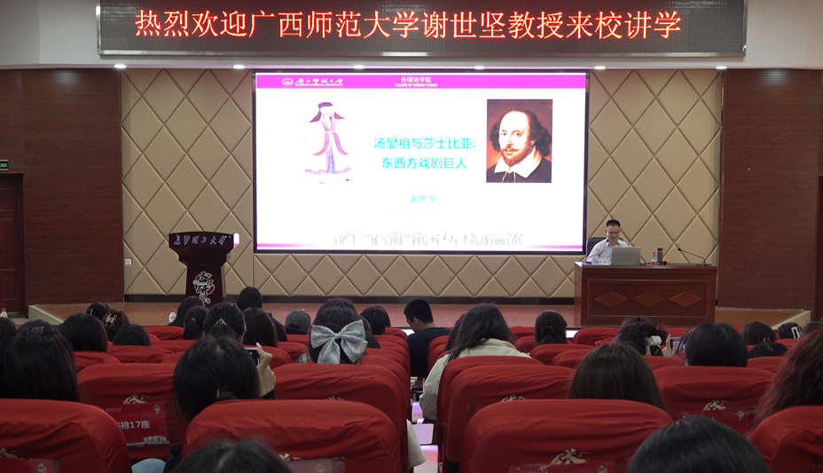 taptap点点体育外国语学院“外国语言文学专业前沿系列名师专题课”于2023年4月13日晚19:00在云塘校区文科楼圆厅A200拉开序幕。广西师范大学外国语学院院长、博士生导师谢世坚教授,讲授题为“汤显祖与莎士比亚:东西方戏剧巨人”的专题讲座。taptap点点体育外国语学院党委副书记周芳、副院长季红琴、教师代表胡珍铭、张鑫璐、王艺以及学生120余人参加了本次讲课。本次讲学由外国语学院副院长季红琴主持。