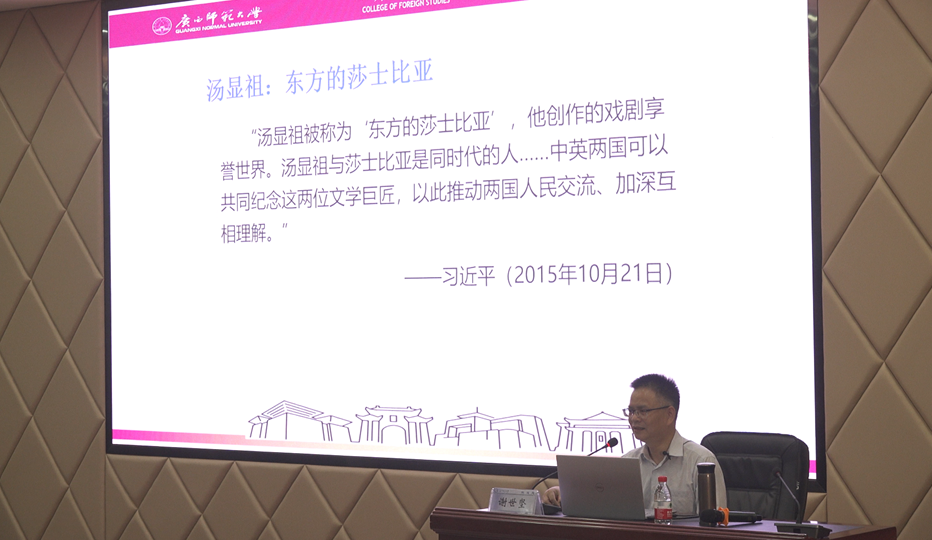 讲座开始时,谢世坚院长用幽默谦虚的语调简单介绍了他在国家社科基金项目中取得的成就,引出本次讲座的主题。谢院长对世界文化史坐标中16、17世纪之交的中国明代晚期与英国伊丽莎白时代分别出现的文学巨匠汤显祖和莎士比亚进行分析比较,一方面是汤显祖戏剧对中国传统戏剧尤其是元明戏曲的历史传承及其伟大成就,另一方面是文艺复兴的英国戏剧与莎士比亚戏剧的伟大成就。