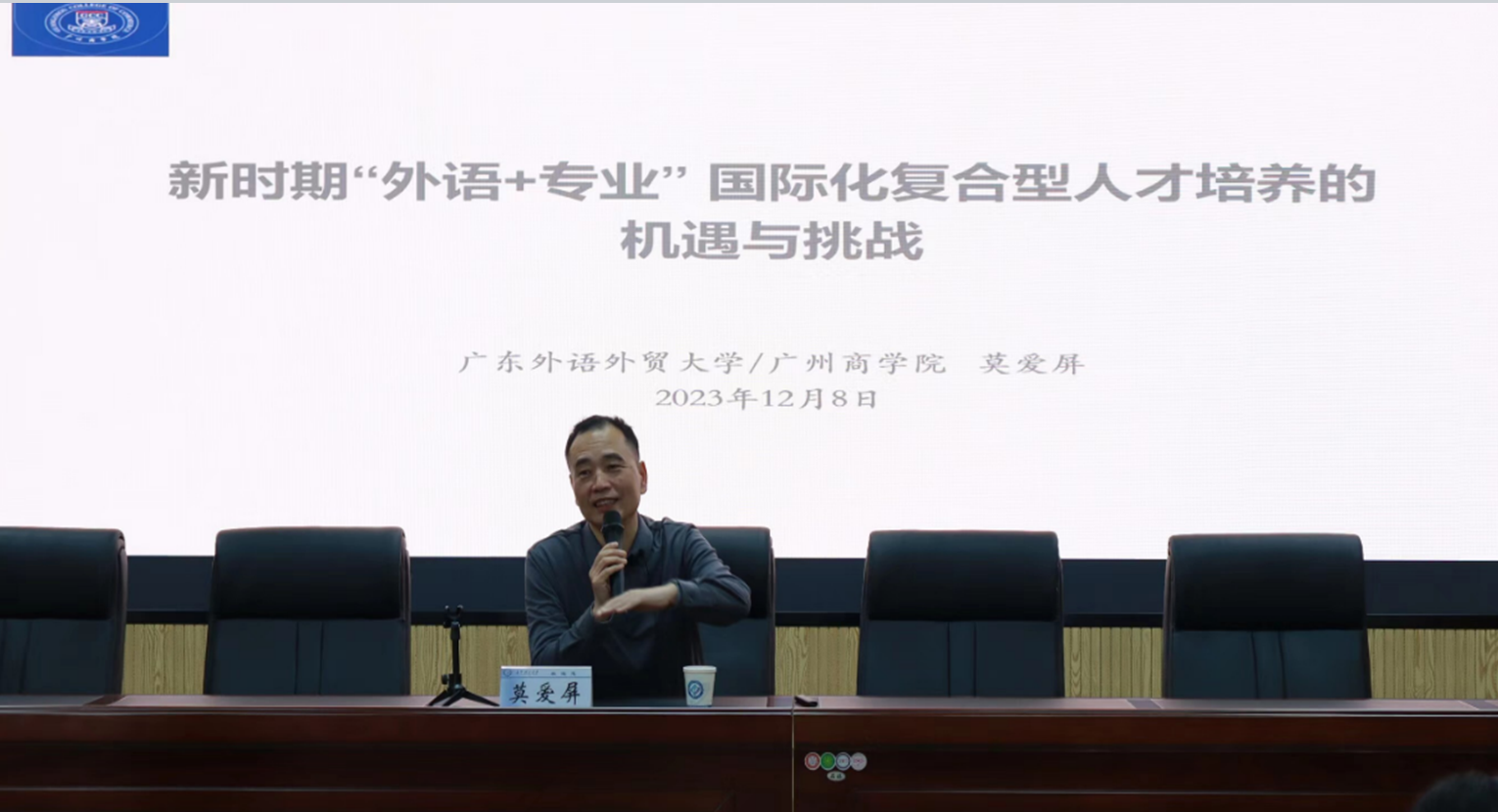 莫爱屏教授为师生带来的讲座题为“新时期‘外语+专业’ 国际化复合型人才培养的机遇与挑战”。数字与人文等领域的融合为“外语+专业”学生学习数字贸易、参与跨境电商活动等提供了良好机遇,同时也对商务英语、英语专业等人才的培养提出了新挑战。莫教授基于对数字人文研究领域新事物/新现象(如ChatGPT)/以及相关理论的思考,向师生介绍了“外语+专业”国际化复合型人才培养的必要性、迫切性、可行性,激励同学们广泛阅读,积极参与实习、志愿者活动、学术交流,拓展视野,积累实践经验,成长为新时期高层次应用型人才。