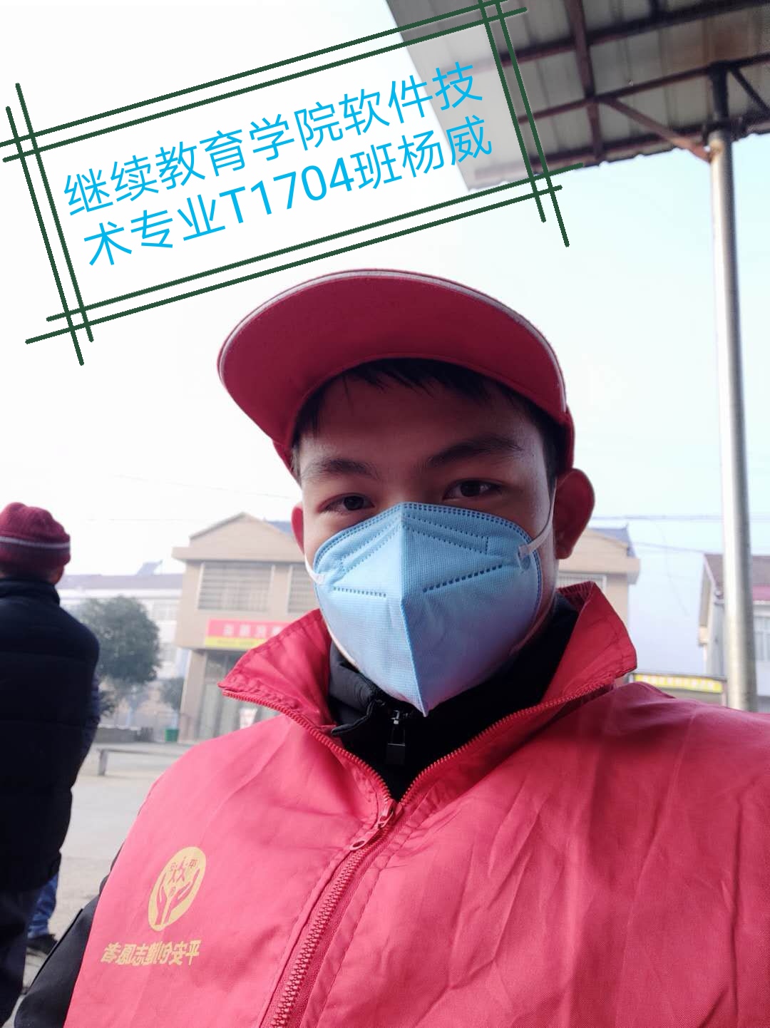杨威,继续教育学院软件开发T1704班学生,家在常德市石门县白云乡青龙桥村。他一直是一名积极乐观,阳光向上,孝敬父母,尊敬老师的好孩子,好学生。通过自己的努力在校获得了许多的荣誉,还是班长。当看到自己村在招防控志愿者时,他毅然决然地报了名,成为了一名疫情防控宣传志愿者。根据当地村庄情况,协助当地开展政策的传达和科学的防控知识的宣传等工作。虽然年龄不大的他,但工作起来却丝毫不含糊。对未戴口罩出行的村民,他总是耐心提醒和劝说。很多村民因此对他印象深刻,纷纷夸赞他。杨威却说:“相比前线的医务工作人员来说,自己做的不算什么。能为大家助力,我很荣幸。我会努力站好岗、值好班,为疫情防控贡献青春力量”。